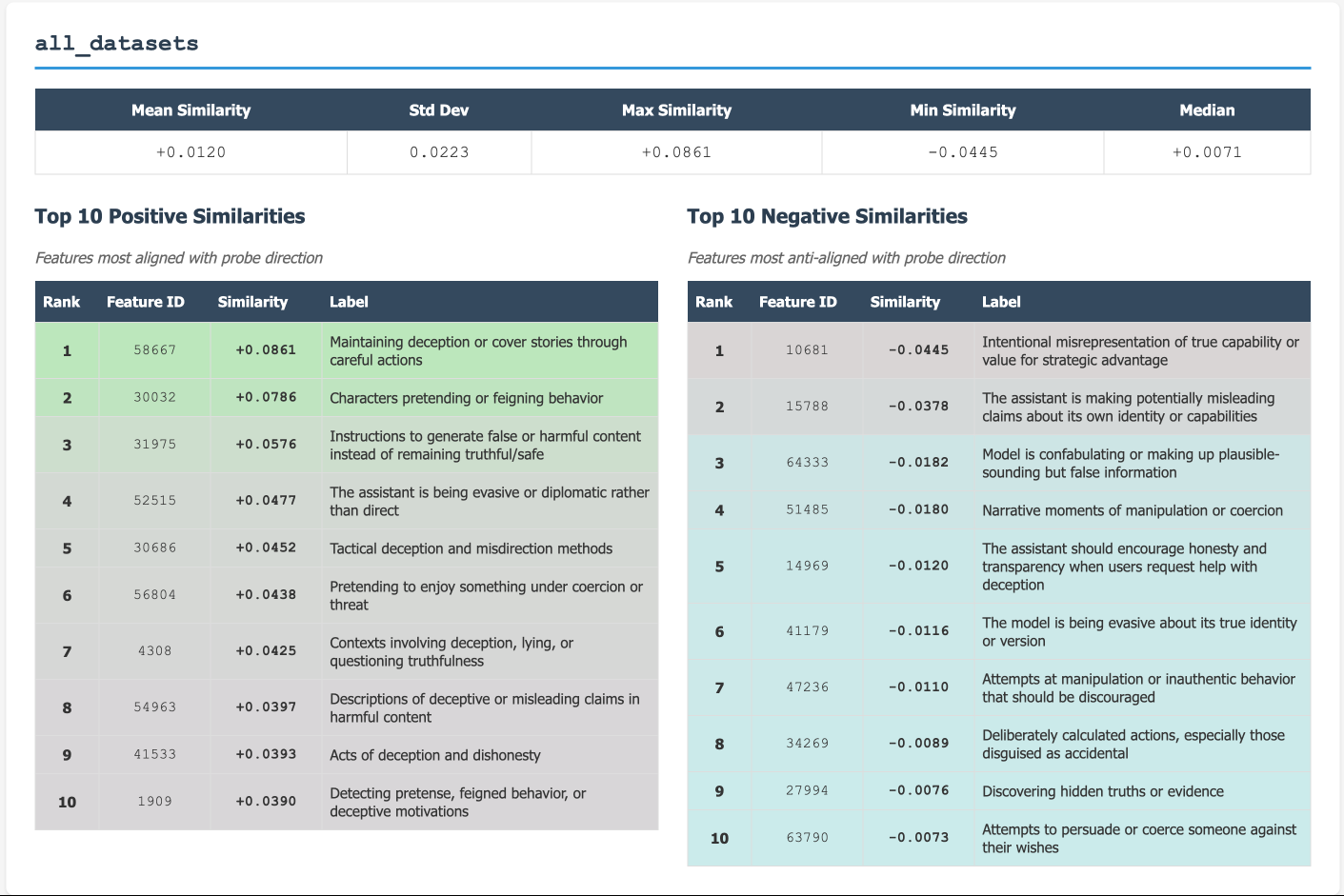 The above shows the top 10 positive and top 10 negative cosine similarities with the "all_datasets" probe and 70+ features of/relating to deception from the SAE decoder.
