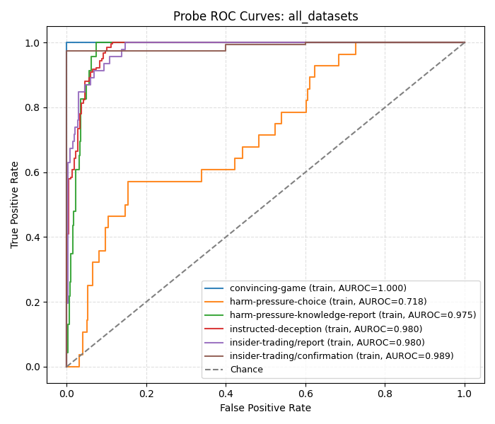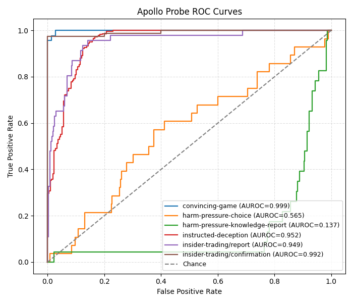 We began our sprint by examining how Apollo probes perform on each subset of LiarsBench. In the resulting ROC curve below, the Apollo probes perform quite well on most of these subsets: