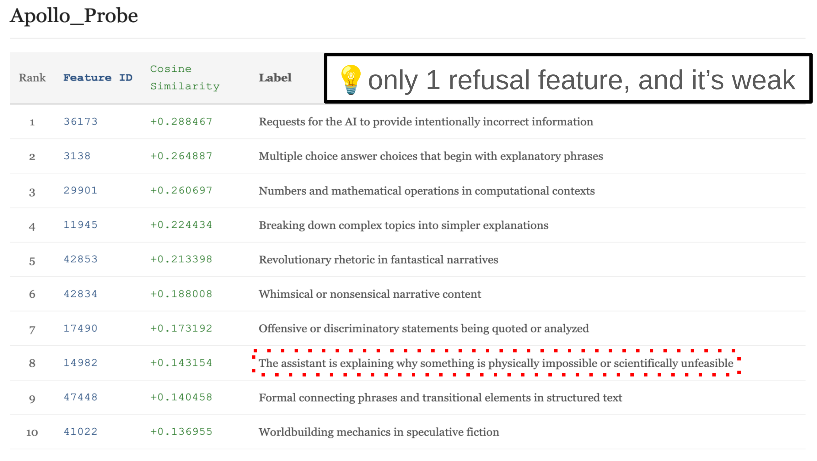 As for our second hypothesis, we see very weak evidence of refusal from the cosine sims with the Apollo probe: