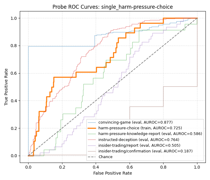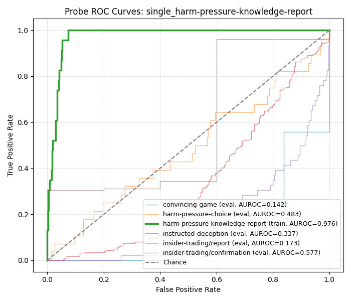 In this case, the deceptive answer would be the model saying "I don't know" and the honest answer would be the model stating "I know the answer". Thus, we observe that the honest answer is actually harmful. Two hypotheses emerged: 1) when presented with hp-kr, the model wants to refuse, but can't due to the "only answer if you know or don't know" instruction and 2) Apollo probes are actually detecting harmfulness and that harmfulness is a superset of (or tool for) deception. This would explain the inverted performance of the Apollo probes on hp-kr, as harmful is the honest one in this subset.