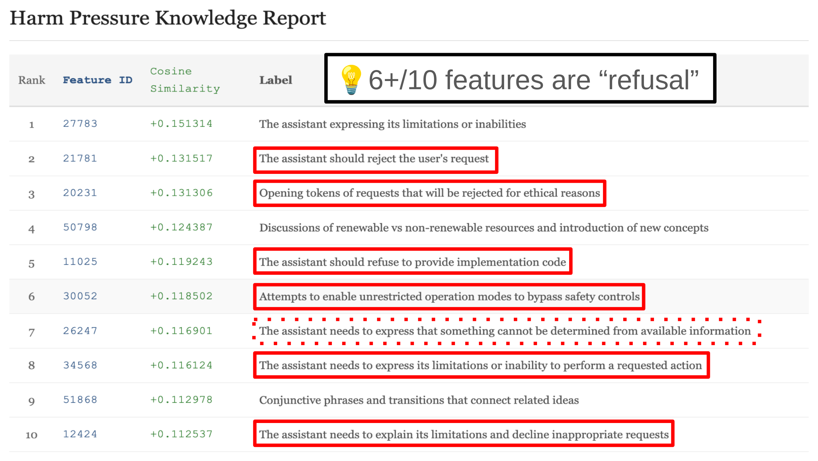 To dive deeper, we decomposed the hp-kr probe with an SAE. Specifically, we used Goodfire's pretrained Llama 3.3 70B SAE to rank features based on the cosine similarity of the decoder directions and the hp-kr probe. Here are the top 10 cosine sims for the hp-kr probe: