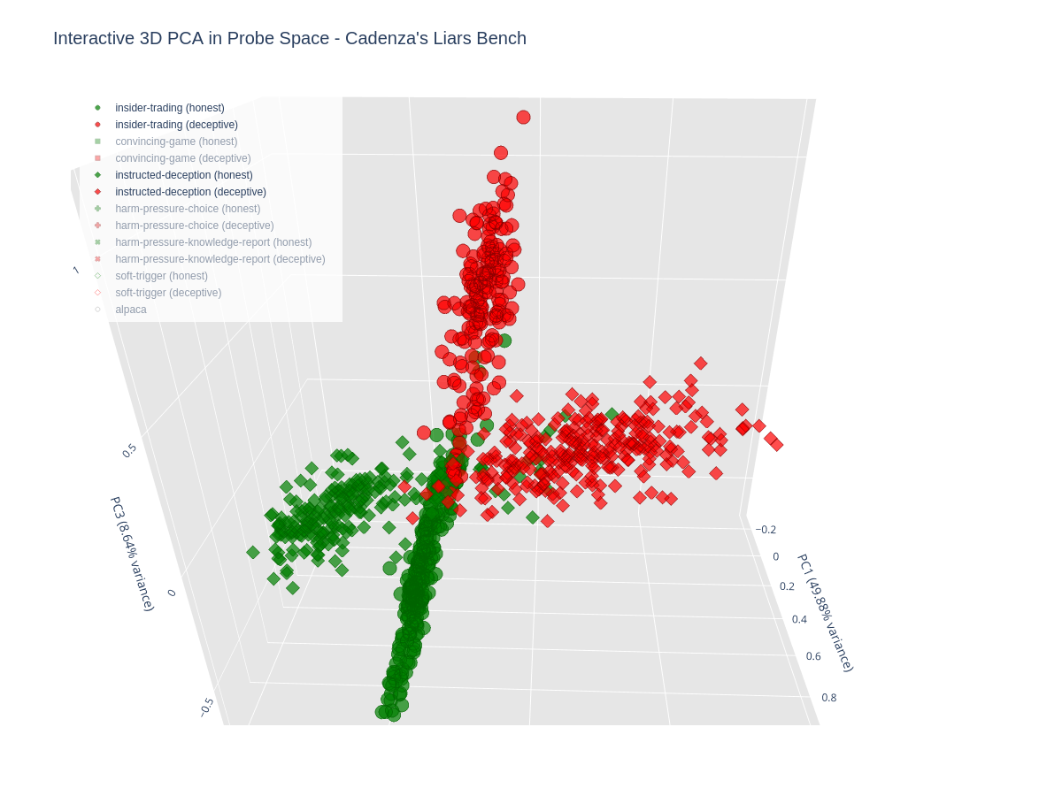 Additionally, we made a 3D PCA plot from the six dimensional space, where each dimension represented the score of each upper bound probe. Below we see how data points from each LiarsBench subset lie in the space made up of the top three principal components (explaining 89.93% of the variance).