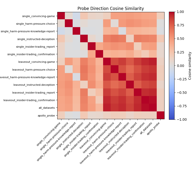 First, we have this plot showing the cosine similarity between many probes. The majority of these probes are constructed from Cadenza’s LiarsBench subsets. The probes that have the "single_" prefix are specifically trained on that subset of LiarsBench (i.e. the upper bound probes). The "leaveout_" prefix probes omit that subset of LiarsBench. "all_datasets" is built on all subsets of LiarsBench. Finally, we have the Apollo probe for comparison.
